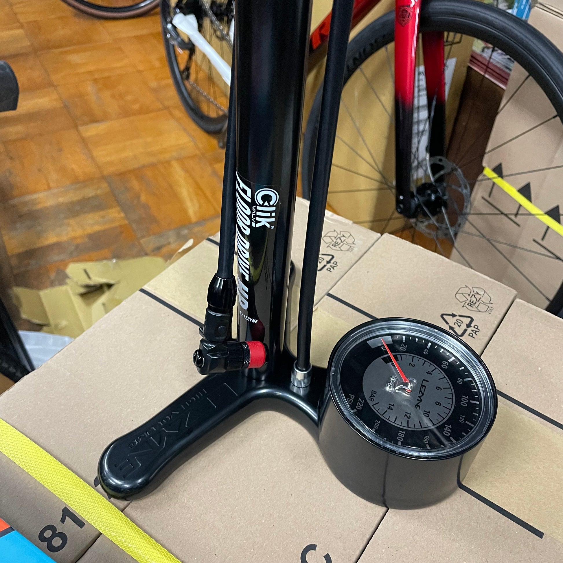※当ページの ”LEZYNE-CLIKフロアポンプ” には、Clik用と従来の仏米用ABS-1チャックの両方が付属しています。